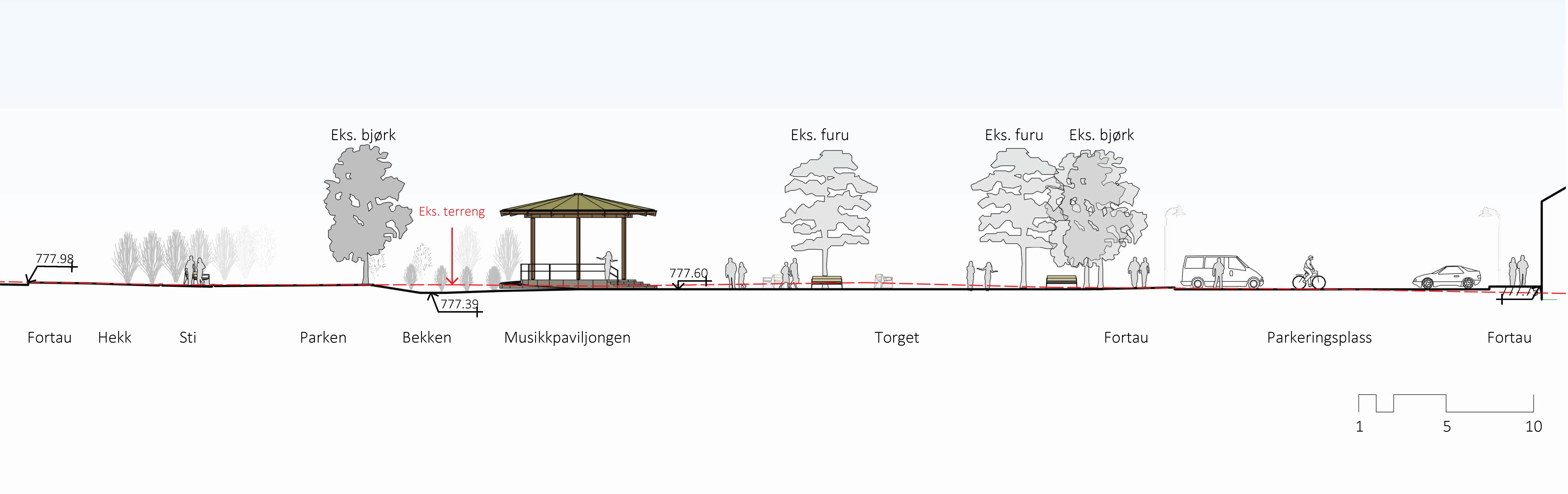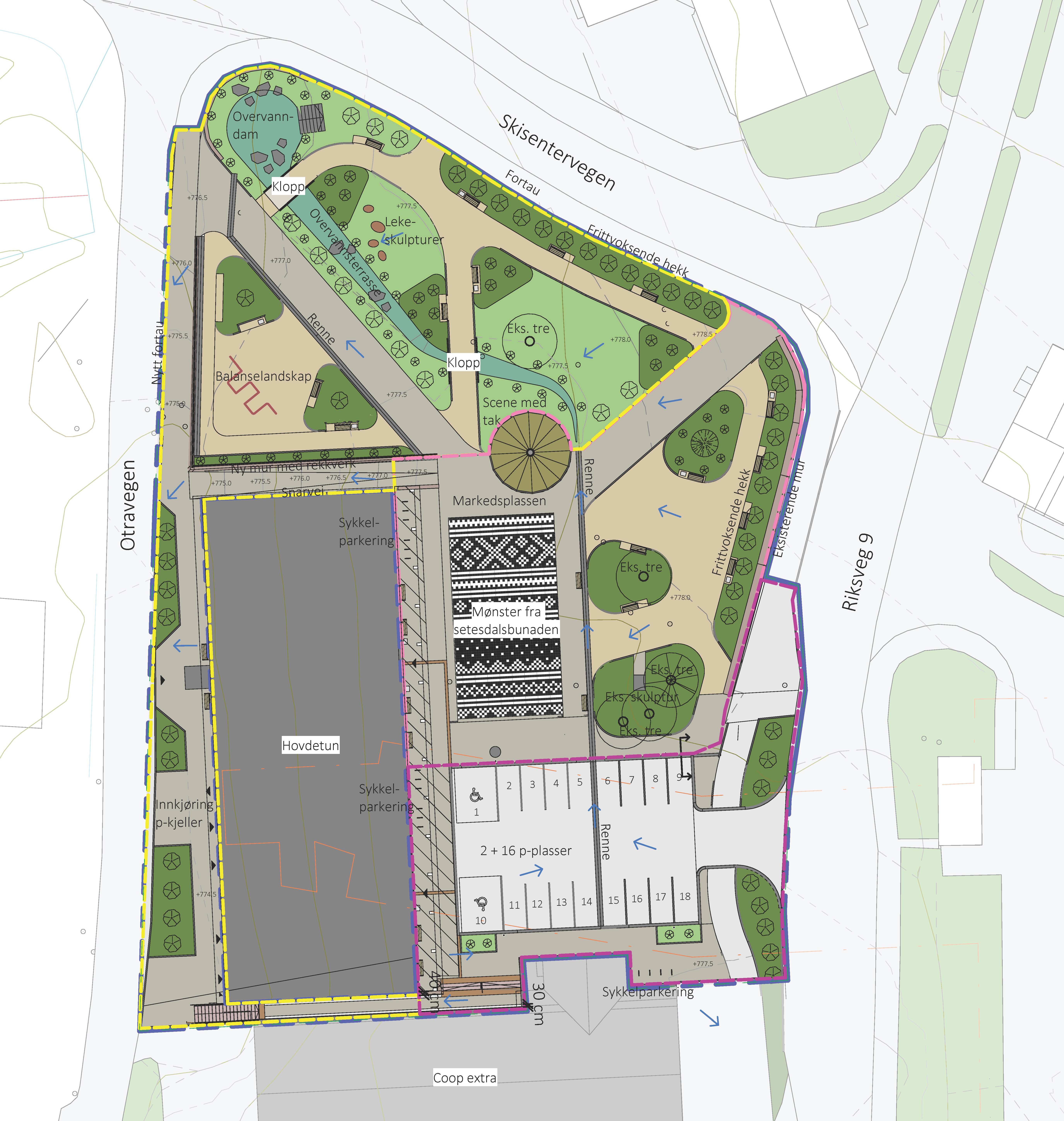 Anlegget skal utformast som ein fjellpark med lokal vegetasjon og kortreiste material. Mønsteret i torgflata er inspirert av tradisjonelt handarbeid frå Setesdal. Det er foreslått ein parkpaviljong og ein leikeplass med balanselandskap. Handtering av overvatn skal bidra til kvalitet i prosjektet og utformast som eit lite vassdrag.