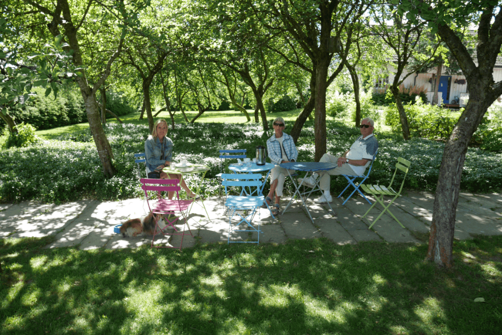 En bjørkeallé fører opp til Stange Gjestegård, der de tre bygningene skaper en gårdsplass. Tuntreet er ei stor eik. Kirsebærtreet lyser opp på våren. Klipte granhekkene skaper lune hagerom. Hvert hus har fått sin hage. Selve driftsbygningen til Gjestegården har en stor, grønn eplehage, som danner en løvsal for stedets mange arrangement. En staudehage, som er på sitt flotteste på høysommeren, er innrammet av lave buksbomhekker.
